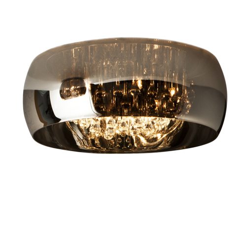 Króm színű fém vázas mennyezeti lámpa tükröződő felületű füstös üveg búrával, átlátszó csepp alakú kristály dekorral, 6db cserélhető G9-es LED fényforrással.
