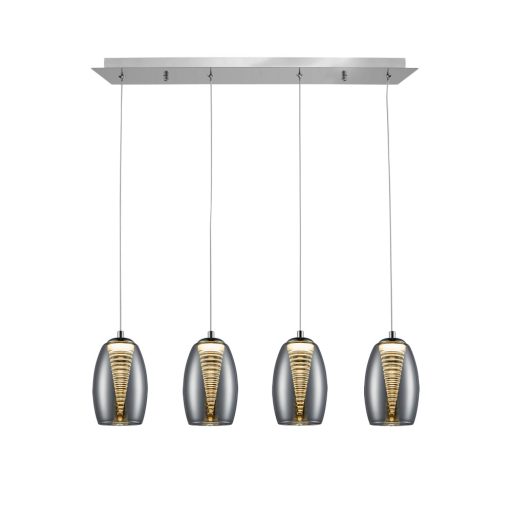 Króm színű fém vázas függeszték lámpa 4db kívül csillámló üveg, belül tölcsér alakú polikarbonát búrával, meleg fehér színhőmérsékletű beépített LED fényforrással. A lámpa belógása felszereléskor 35-120cm között állítható.