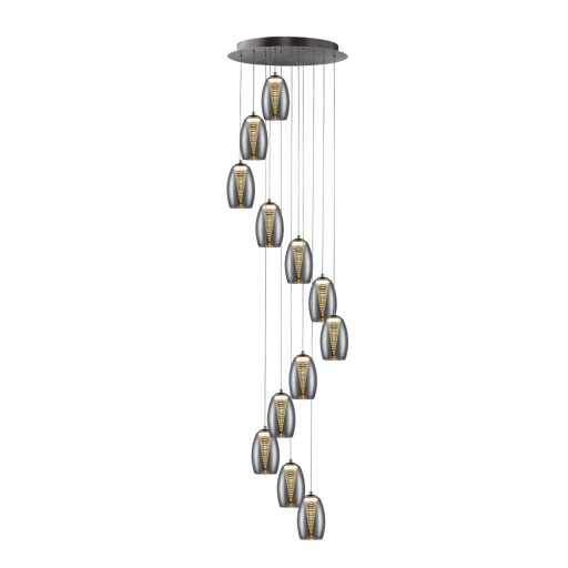 Króm színű fém vázas függeszték lámpa 12db kívül csillámló üveg, belül tölcsér alakú polikarbonát búrával, meleg fehér színhőmérsékletű beépített LED fényforrással. A lámpa belógása felszereléskor 120-350cm között állítható.