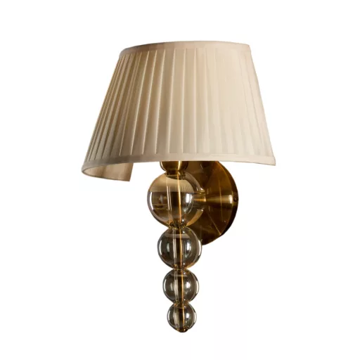 Sárgaréz színű fém vázas falikar pezsgő színű üveg gömb dekorral, bézs színű rakott lámpaernyővel, 1db E27-es fényerőszabályozható E27-es LED fényforrással.