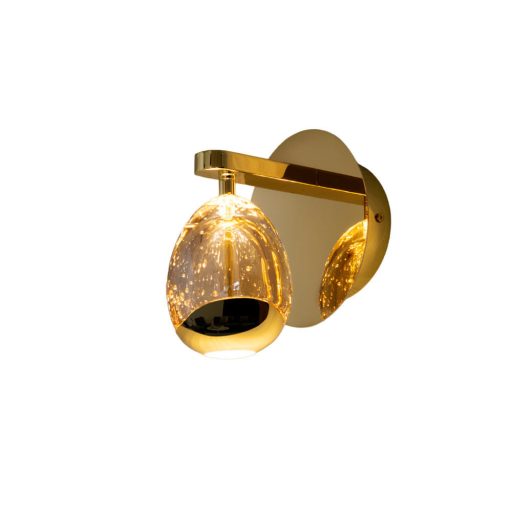 Arany színű fém vázas fali lámpa csepp alakú búrával, dekoratív buborék dekoros pezsgő színű üveg kivitelben, meleg fehér színhőmérsékletű beépített LED fényforrással.