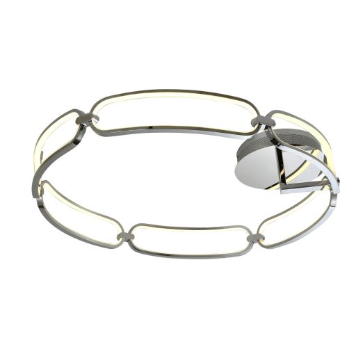 Króm színű súrolt alumínium mennyezeti lámpa 80cm átmérőjű opálos szilikon betétes búrával, meleg fehér színhőmérsékletű beépített LED fényforrással. A lámpa fényereje szabályozható arra alkalmas fali kapcsoló segítségével.
