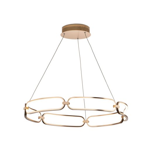 Rózsaarany színű súrolt alumínium függeszték lámpa 60cm átmérőjű opálos szilikon betétes búrával, meleg fehér színhőmérsékletű beépített LED fényforrással. A lámpa belógása felszereléskor 50-115cm között állítható. A lámpa fényereje szabályozható arra alkalmas fali kapcsoló segítségével.
