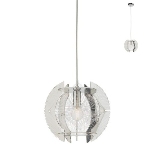 Fényer króm színű fém vázas függeszték fényes akril lamellás, áttetsző nejlon szállal dekorált búrával.