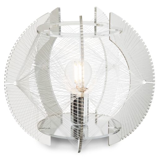 Fényer króm színű fém vázas asztali lámpa fényes akril lamellás, áttetsző nejlon szállal dekorált búrával, vezetékre szerelt kapcsolóval.