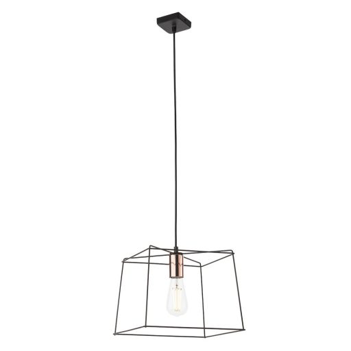 Fekete színű fém vázas függeszték fényes réz színű foglalattal, szögletes fémrács búrával.