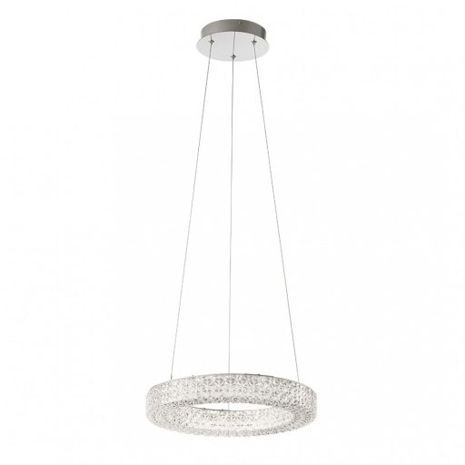 Króm színű fém vázas függeszték gyűrű alakú, kristály hatású áttetsző akril búrával, beépített LED fényforrással.
