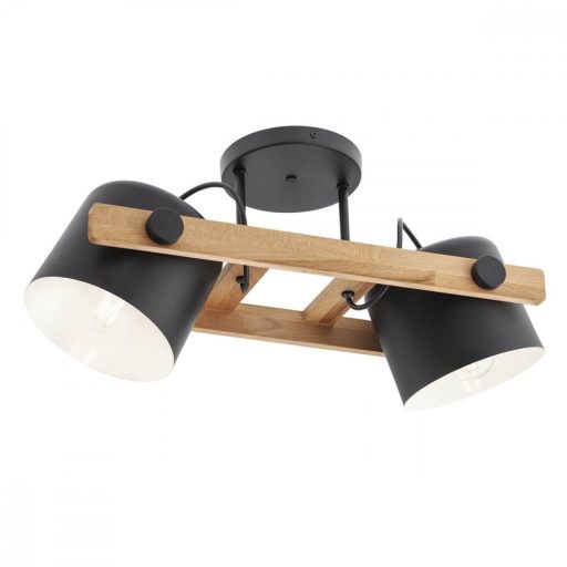 Fekete színű fém és tölgyfa vázas mennyezeti lámpa belül fehér színű fém billenthető búrákkal, E27-es foglalattal.