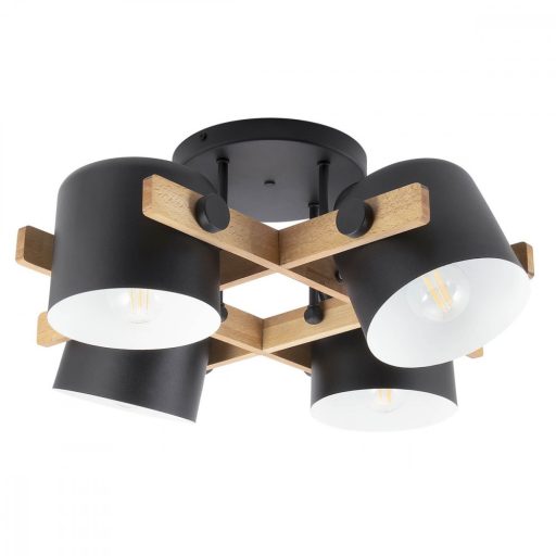 Fekete színű fém és tölgyfa vázas mennyezeti lámpa belül fehér színű fém billenthető búrákkal, E27-es foglalattal.