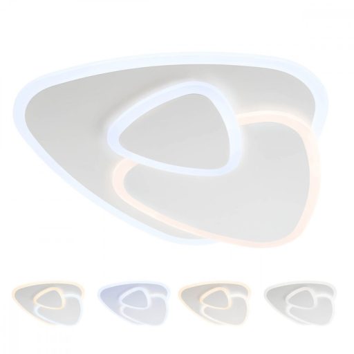 Matt fehér színű fém vázas, akril betétes menyezeti lámpa 55W beépített LED fényforrással. A lámpához távirányító tartozék, mely segítségével állítható al ámpa fényereje, színhőmérséklete (3000-4000-6000K), illetve időzíthető és éjszakai fény funkcióval is rendelkezik.