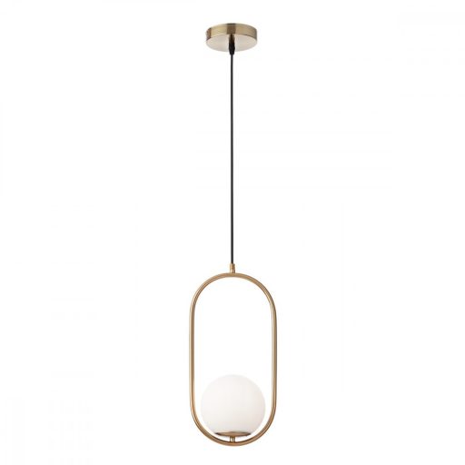 Matt arany színű fém vázas függeszték lámpa gömb alakú, opál üveg búrával, E14-es foglalattal. A lámpa fényforrást nem tartalmaz.