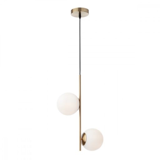 Matt arany színű fém vázas függeszték lámpa gömb alakú, opál üveg búrával, E14-es foglalattal. A lámpa fényforrást nem tartalmaz.