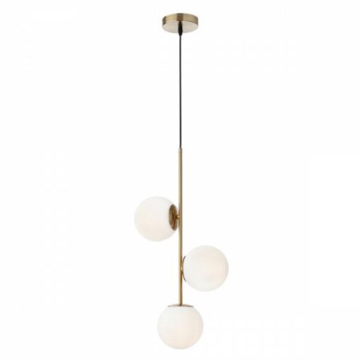 Matt arany színű fém vázas függesztett lámpa 3db, 15cm átmérőjű, gömb alakú, opál üveg búrával, E14-es foglalattal.