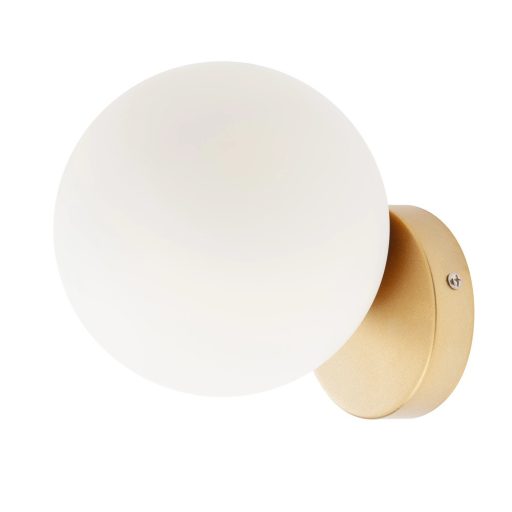 Matt arany színű fém vázas fali lámpa 15cm átmérőjű, gömb alakú fehér opál üveg búrával, 1db E14-es foglalattal.