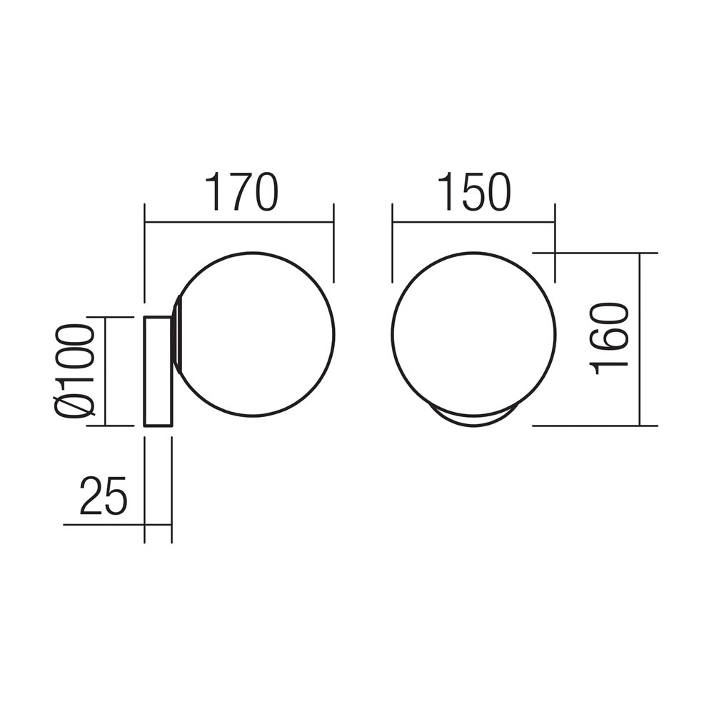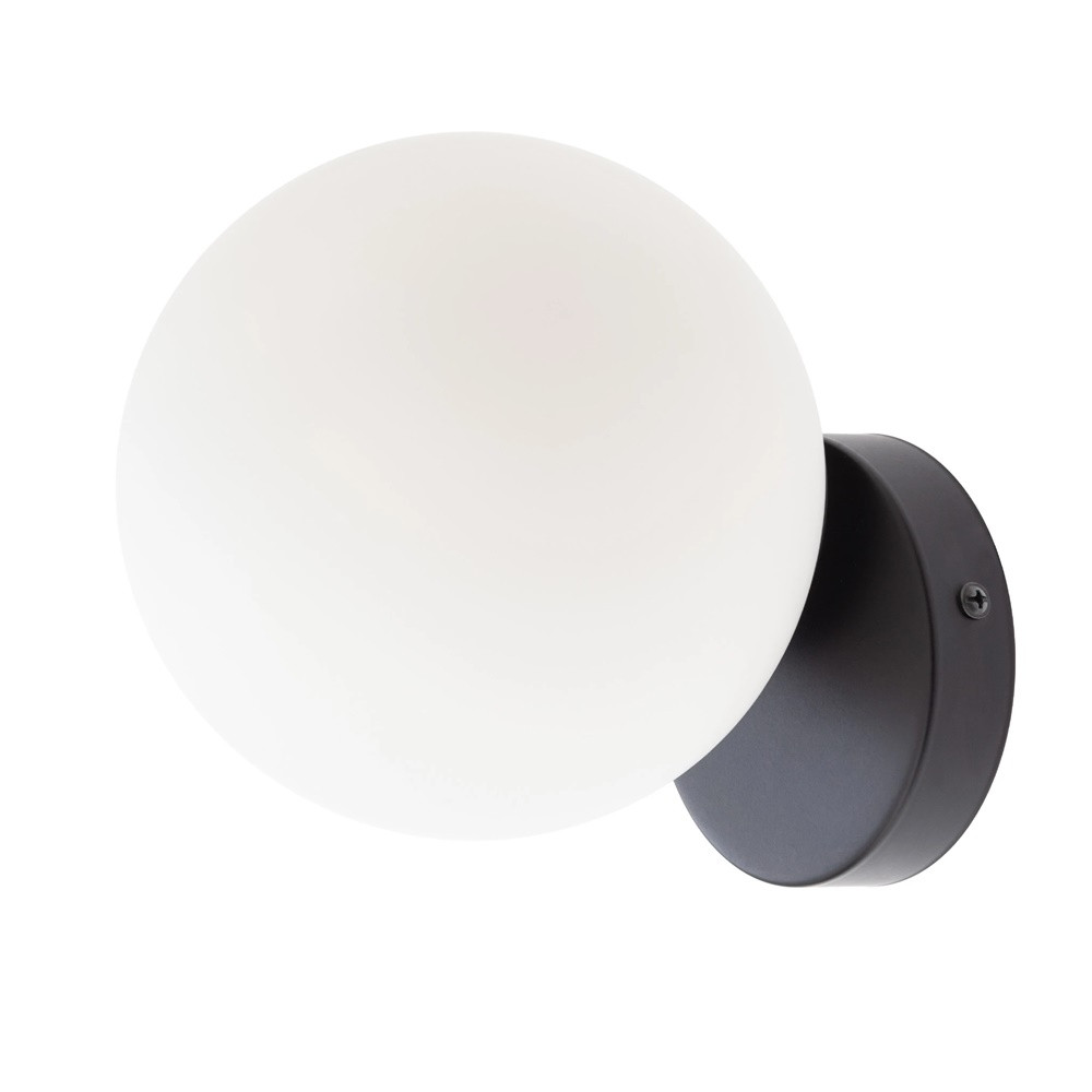 Matt fekete színű fém vázas fali lámpa 15cm átmérőjű, gömb alakú fehér opál üveg búrával, 1db E14-es foglalattal.