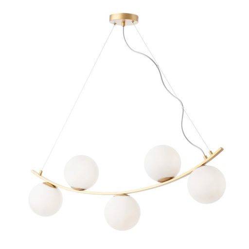 Matt arany színű fém vázas függesztett lámpa 5db 15cm átmérőjű, gömb alakú fehér opál üveg búrával, E14-es foglalattal.