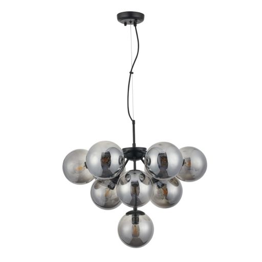 Matt fekete színű fém vázas függesztett lámpa 10db 15cm átmérőjű, gömb alakú, füstszínű üveg búrával, E14-es foglalattal.