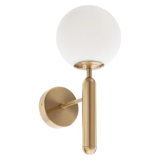 Sárgaréz színű fém vázas fali lámpa opálos üveggömb búrával, E14-es foglalattal.