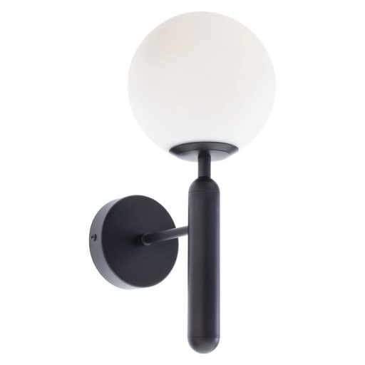 Matt fekete színű fém vázas fali lámpa opálos üveggömb búrával, E14-es foglalattal.