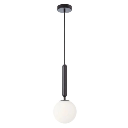 Matt fekete színű fém vázas függesztett lámpa opálos üveggömb búrával, E14-es foglalattal.