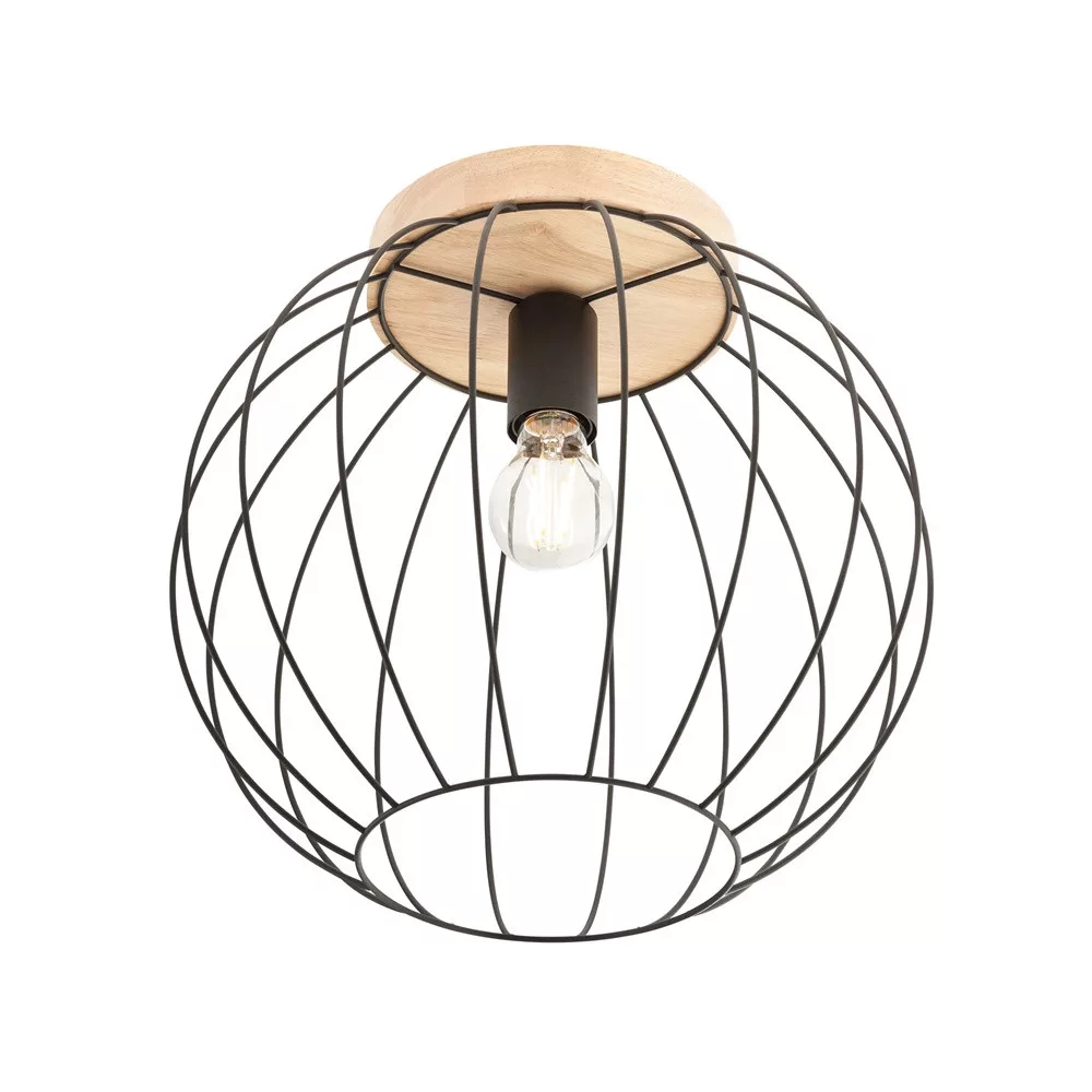 Matt fekete színű fém és natur fa vázas mennyezeti lámpa rácsos búrával, 1db E27-es foglalattal.