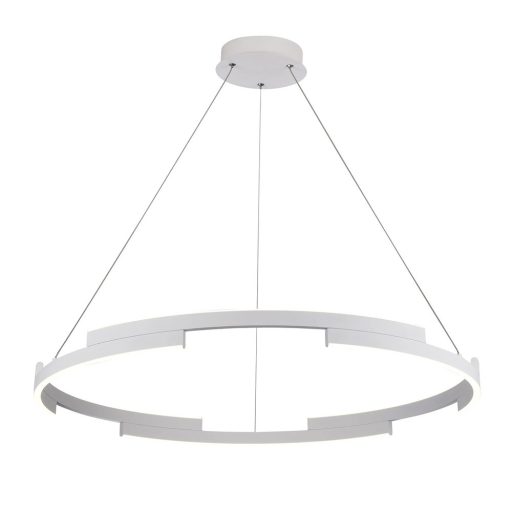 Matt fehér színű fém és alumínium anyagokból készült függesztett lámpa opálos műanyag betétes, 80cm átmérőjű búrával, meleg fehér színhőmérsékletű, 3 lépcsőben szabályozható fényerejű beépített LED fényforrással.