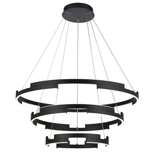 Matt fekete színű fém és alumínium anyagokból készült függesztett lámpa opálos műanyag betétes, 40, 60 és 80cm átmérőjű búrával, meleg fehér színhőmérsékletű, 3 lépcsőben szabályozható fényerejű beépített LED fényforrással.