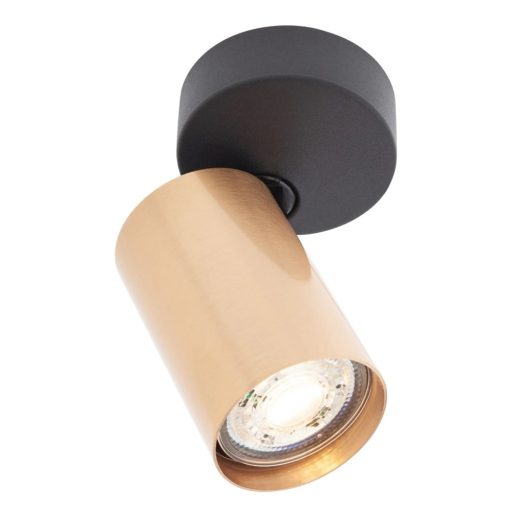 Matt fekete színű fém vázas falra és mennyezetre egyaránt szerelhető spot lámpa arany színű alumínium búrával, GU10-es foglalattal.