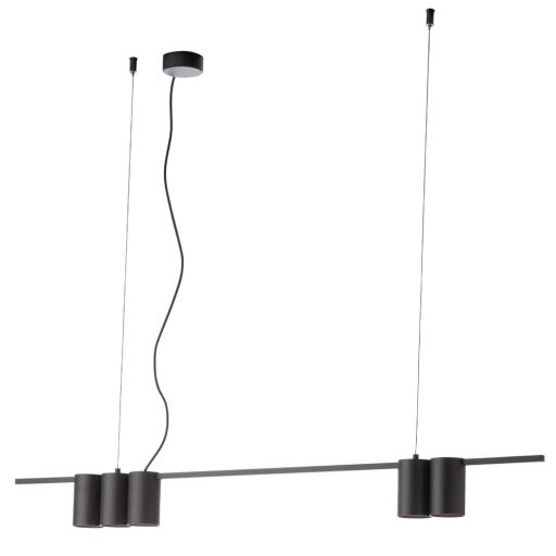 Matt fekete színű fém vázas függesztett lámpa 5db fekete színű alumínium búrával, GU10-es foglalattal, rövidíthető belógással.