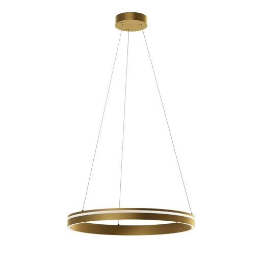 Matt arany színű fém és alumínium függesztett lámpa szilikon betétes, 59,2cm átmérőjű búrával, beépített LED fényforrással. A lámpa színhőmérséklete állítható meleg, vagy természetes fehér (3000/4000K) színre.