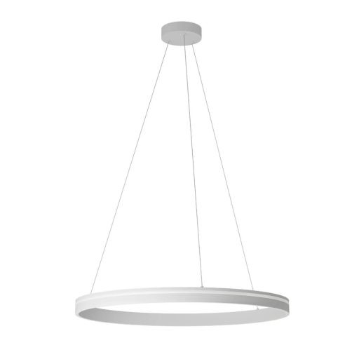 Matt fehér színű fém és alumínium függesztett lámpa szilikon betétes, 79,3cm átmérőjű búrával, beépített LED fényforrással. A lámpa színhőmérséklete állítható meleg, vagy természetes fehér (3000/4000K) színre.