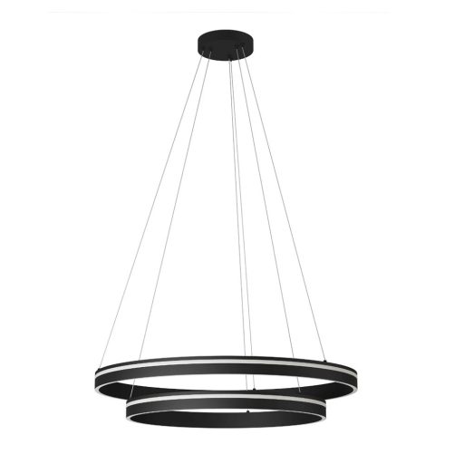 Matt fekete színű fém és alumínium függesztett lámpa szilikon betétes, 59,2 és 79,3cm átmérőjű búrával, beépített LED fényforrással. A lámpa színhőmérséklete állítható meleg, vagy természetes fehér (3000/4000K) színre.