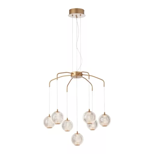 Matt arany színű fém vázas csillár 6db áttetsző, mintás acryl búrával, meleg fehér színhőmérsékletű beépített LED fényforrással. A lámpafejek önmagukban fixen 51cm-t lógnak le, ehhez jön még max. 100cm belógás a mennyezet rózsából, ami rövidíthető.