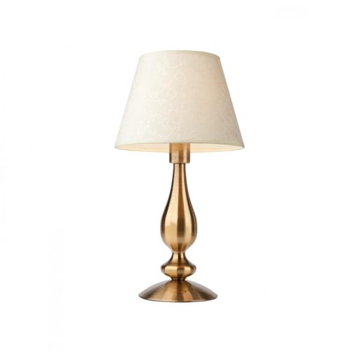 Klasszikus stílusú asztali lámpa, antik réz színű fémszerkezettel és nyomott mintás textil lámpaernyővel. A lámpa vezetékre szerelt kapcsolóval rendelkezik.