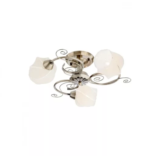 Klasszikus stílusú mennyezeti lámpa, antik réz színű fémszerkezettel, virág dekorral, és fehér szatinált üveg búrával, áttetsző díszítőelemekkel.