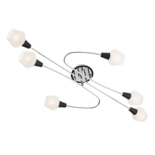 Matt fekete és króm színű fém vázas mennyezeti lámpa átlátszó, üveg kristálygranulátumos búrával.
