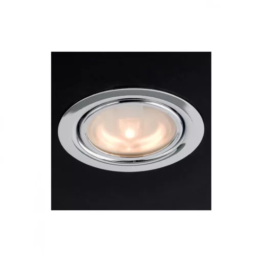Króm színű, beépíthető, kerek spot lámpa, fém vázzal és üveglappal.