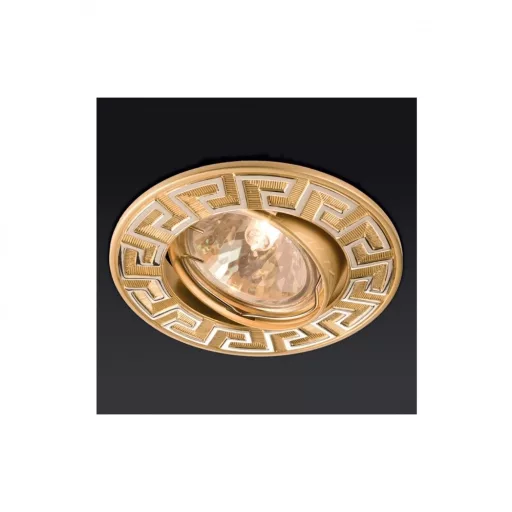 Ezüst és gyöngyházas arany színű, beépíthető, kerek, görög mintás mennyezeti spot lámpa, zamak (cink-alumínium ötvözet) vázzal, billenthető fejjel.