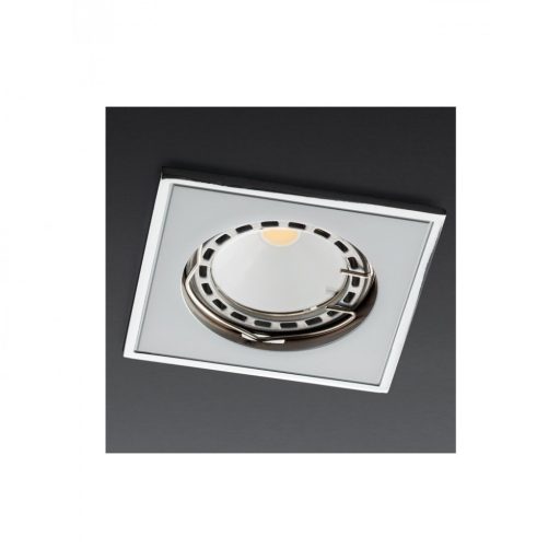 Beépíthető, szögletes mennyezeti spot lámpa, gyöngyházas és króm színű alumínium vázzal.