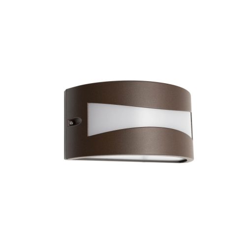 Sötét barna színre festett alumínium vázas kültéri fali lámpa opálos polikarbonát búrával, beépített LED fényforrással, IP54-es védelemmel.