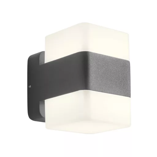 Sötét szürke színű alumínium vázas kültéri fali lámpa opál polikarbonát búrával, beépített, meleg fehér színhőmérsékletű LED fényforrással, IP44-es védelemmel. A lámpa felfelé és lefelé egyaránt világít.