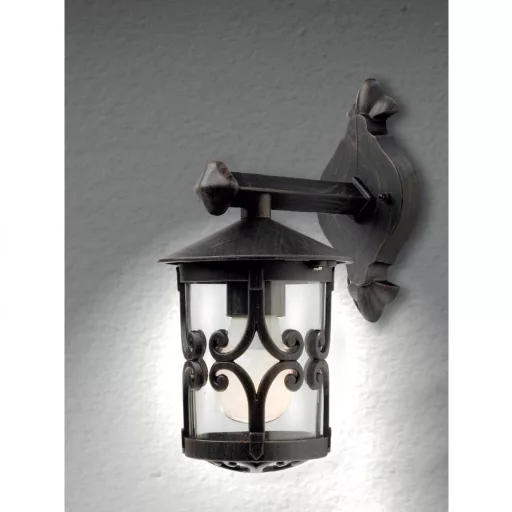 Kültéri fali lámpa patinás, rozsdabarna színű alumínium vázzal és átlátszó üveg búrával, IP 23-as védelemmel.