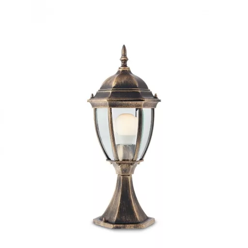 Klasszikus stílusú, kültéri álló lámpa, patinás arany színű alumínium vázzal, átlátszó üveg búrával, IP44-es védelemmel.