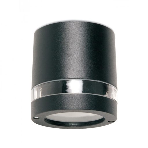 Matt fekete színű, alumíniumöntvény kültéri mennyezeti lámpa, átlátszó polikarbonát búrával és IP44-es védelemmel.