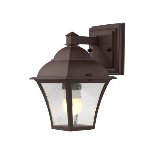 Klasszikus stílusú, kültéri fali lámpa, antik barna színű alumínium vázzal és légbuborék mintás üveg búrával, IP23-as védelemmel.