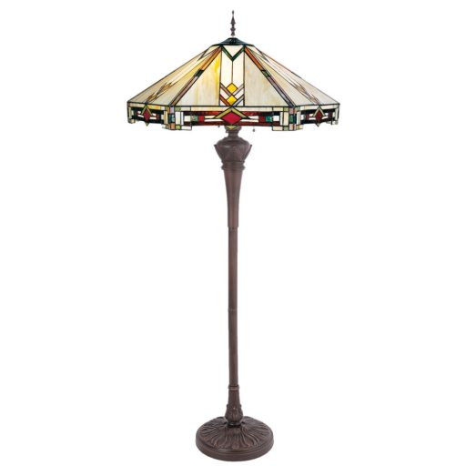 Bronzos barna színű polyresin vázas álló lámpa 58cm átmérőjű, bézses árnyalatú alapon színes szögletes elemes Tiffany üveg búrával, húzókapcsolóval. A lámpában 3 db külön kapcsolható E27-es foglalat található.