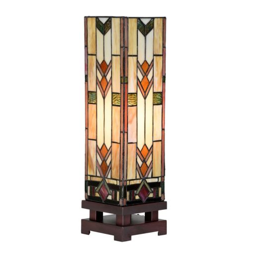 Oszlopos asztali lámpa polyresin vázzal, bézs alapon sárga piros és zöld színű Tiffany üveg búrával, 1db E27-es foglalattal, vezetékre szerelt kapcsolóval.
