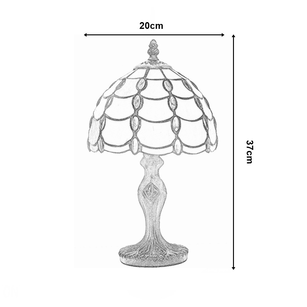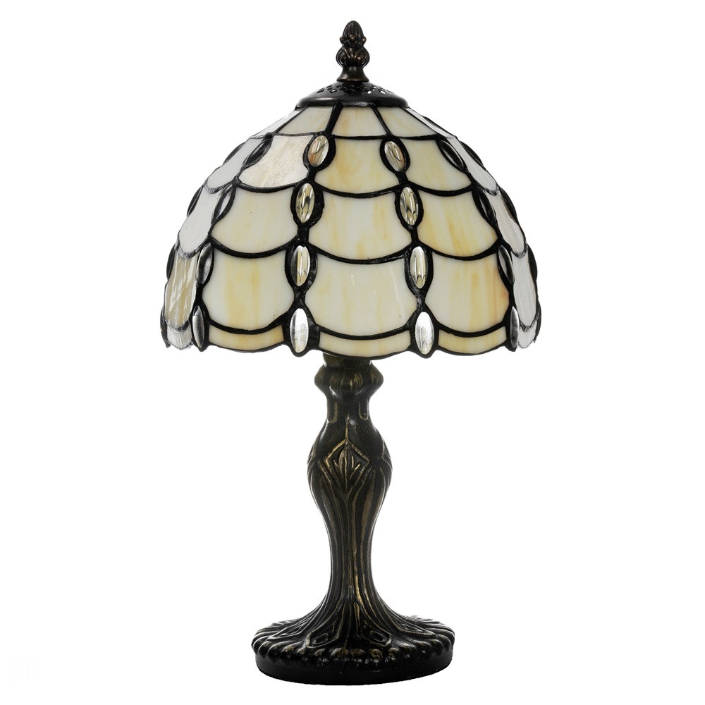 Antikolt barna színű fém talpas Tiffany asztali lámpa 20cm átmérőjű, bézses alapon átlátszó gyöngy dekoros Tiffany üveg búrával, vezetékre szerelt kapcsolóval.