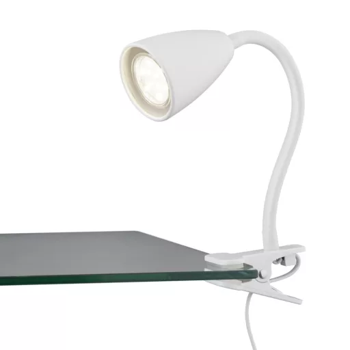 Fehér színű fém vázas csiptethető lámpa fehér színű fém búrával, MR16 GU10-es foglalattal. A lámpa egyéb jellemzői: vezetékre szerelt kapcsoló, állítható fejű lámpa.