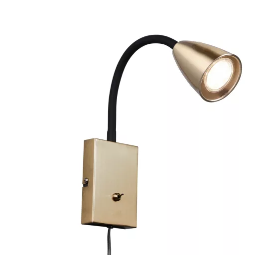 Réz színű fém vázas fali lámpa réz színű fém búrával, MR16 GU10-es foglalattal. A lámpa egyéb jellemzői: kapcsoló a lámpatesten, állítható fejű lámpa .